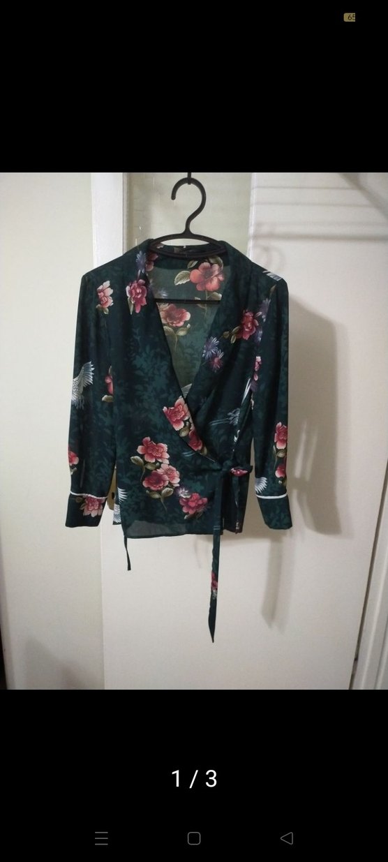 Çiçek desenli, koyu renkli, V yakalı ve uzun kollu kadın bluzudur. Düğmeli detaylı, bol kesim ve midi boyda, sentetik kumaştan üretilmiştir. Günlük bohem tarz için uygundur.