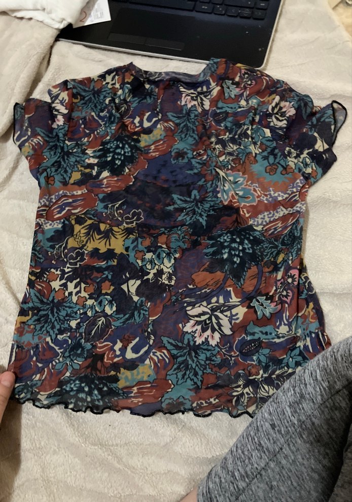 Kadın bluz, bol kesim, V yaka ve kısa fırfırlı kollara sahip. Koyu renkli, çok renkli çiçek desenli, bohem tarzda, günlük kullanıma uygun.