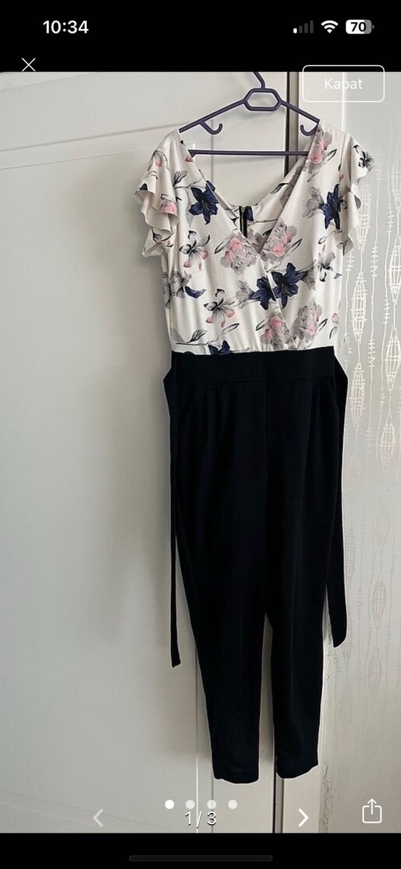 Çiçek desenli, V yaka ve kısa kollu kadın tulumu. Beyaz üst kısmı ve koyu renk kemerli pantolonlu, rahat kesim ve midi boyda.