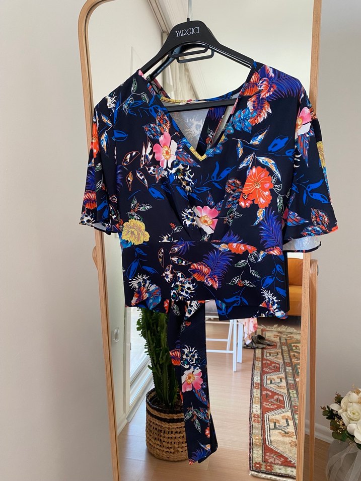V yaka ve kısa kollu, bol kesim çiçek desenli bluz. Koyu zemin üzerinde canlı çok renkli baskıya sahip, yumuşak sentetik kumaştan.
