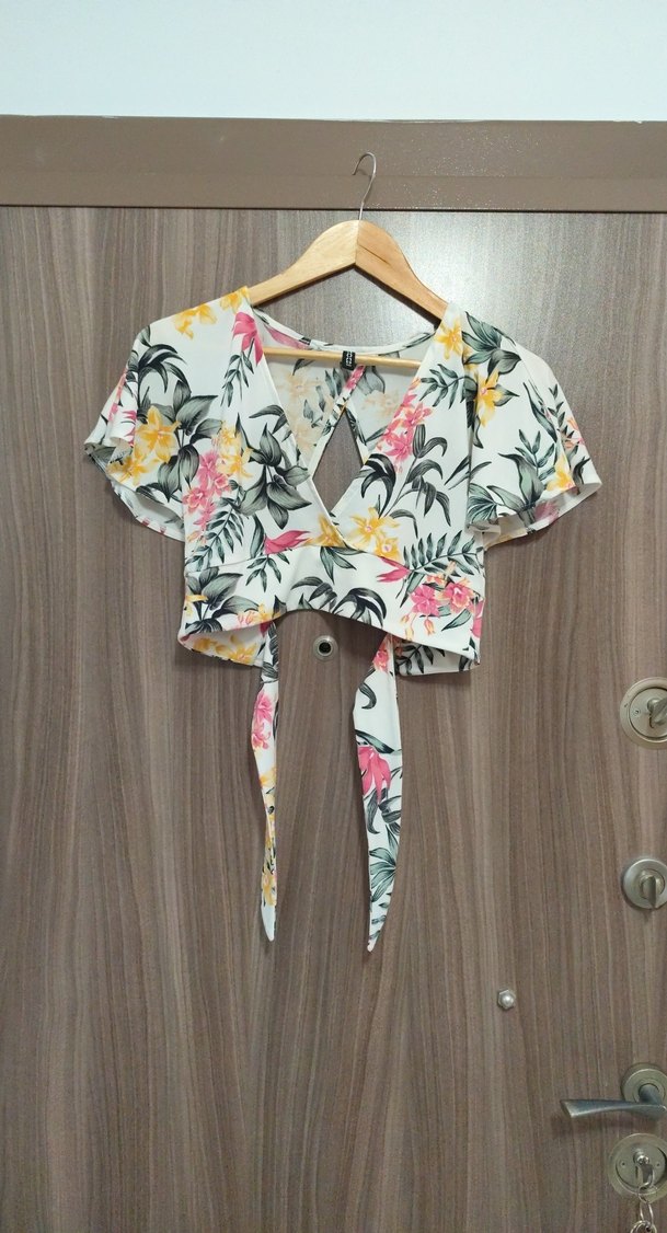 Bohem tarzda, V yaka, kısa kollu, bol kesim, renkli çiçek desenli bluz. Önünde bağlamalı kemer bulunur, yumuşak sentetik kumaştan üretilmiştir.