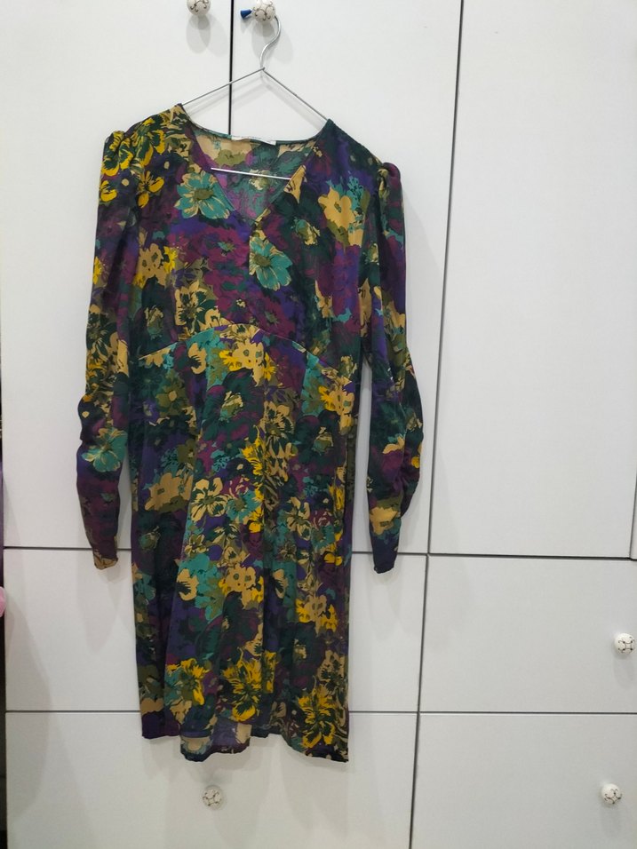 Uzun kollu, bol kesim midi elbise, koyu çok renkli tie-dye çiçek desenli ve drapeli tasarıma sahip, günlük kullanıma uygun.