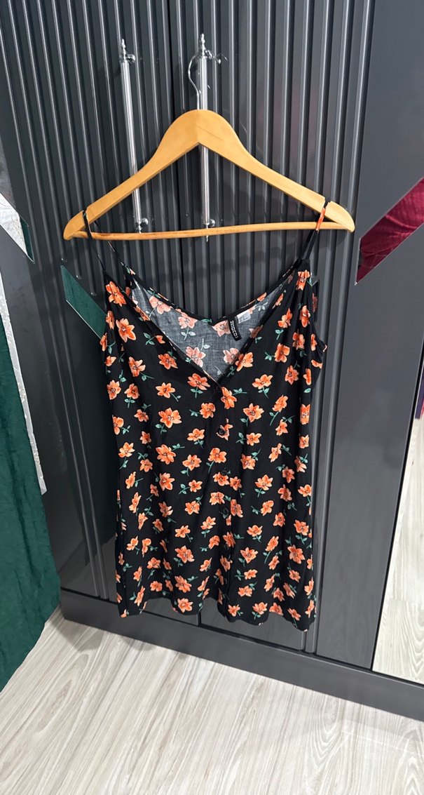 Kolsuz, V yaka ve düğmeli midi elbise. Gevşek kesimli, koyu çiçek desenli ve sentetik kumaştan. Günlük kullanıma uygun.
