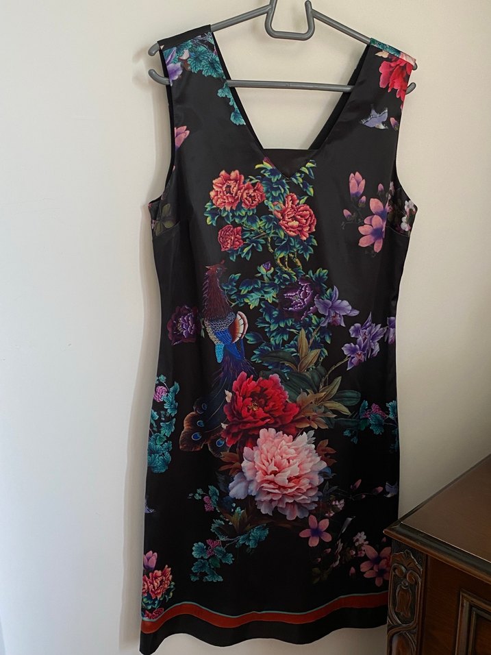 Kolsuz, v yaka, çiçek desenli bu midi elbise, bohem tarzdadır. Astarlıdır. Parlak kumaştır. Midi boydadır.