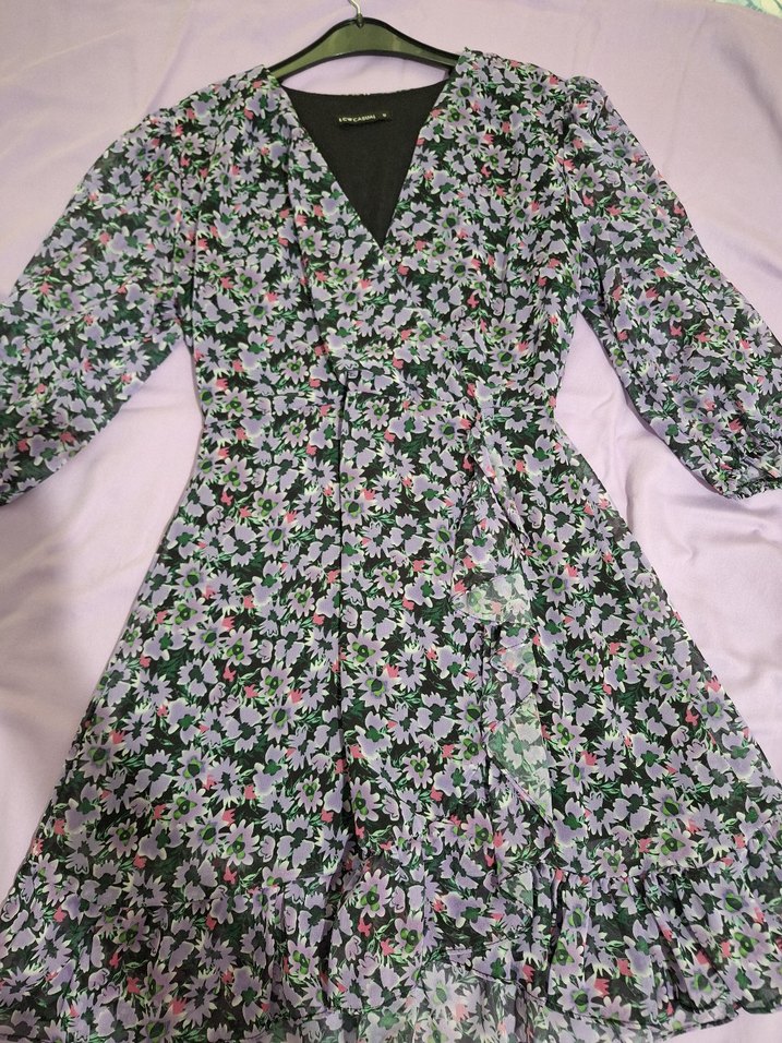 Bohem tarzda, koyu renkli çiçek desenli midi elbise. V yaka, uzun kollu, düğmeli ve bol kesim, yumuşak sentetik kumaştan üretilmiştir.