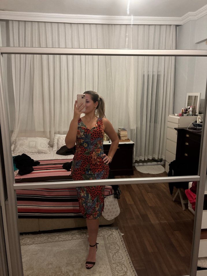 V yaka ve ince askılı, sentetik kumaştan yapılmış, çok renkli çiçek ve leopar desenli, vücuda oturan midi elbise. Romantik akşamlar için ideal