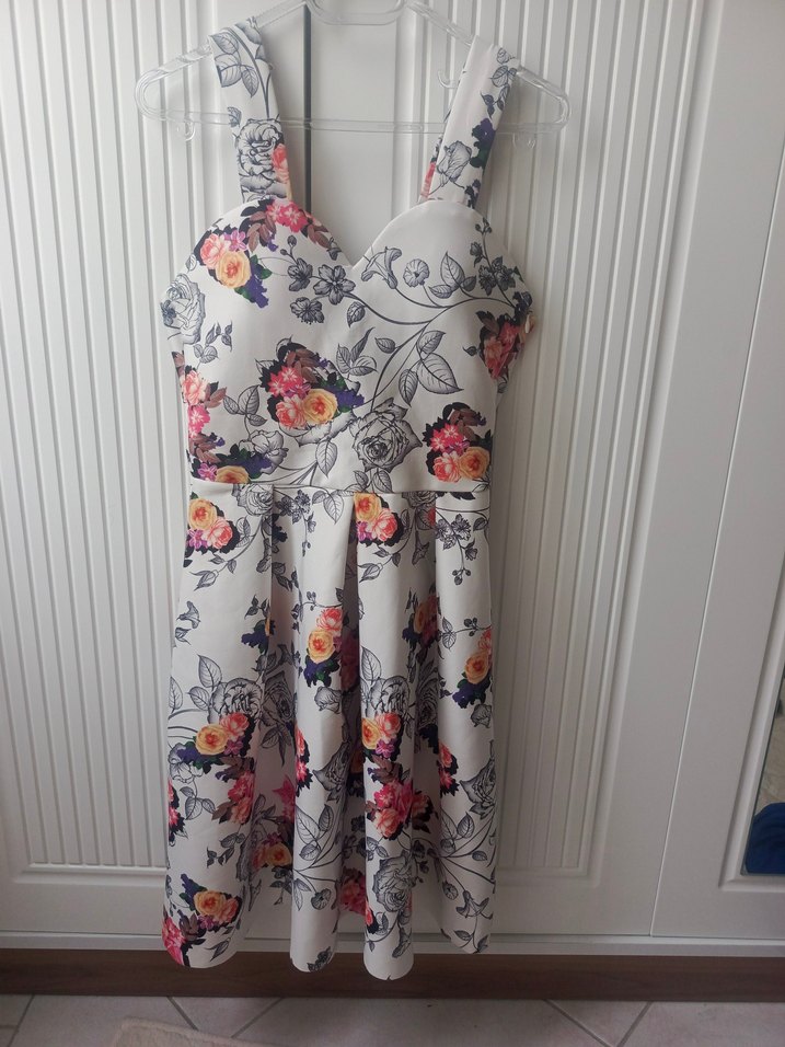 Çiçek desenli, V yaka, kolsuz midi elbise. Fitted kesim ve pile detaylı etek kısmı ile bohem tarzına uygun.