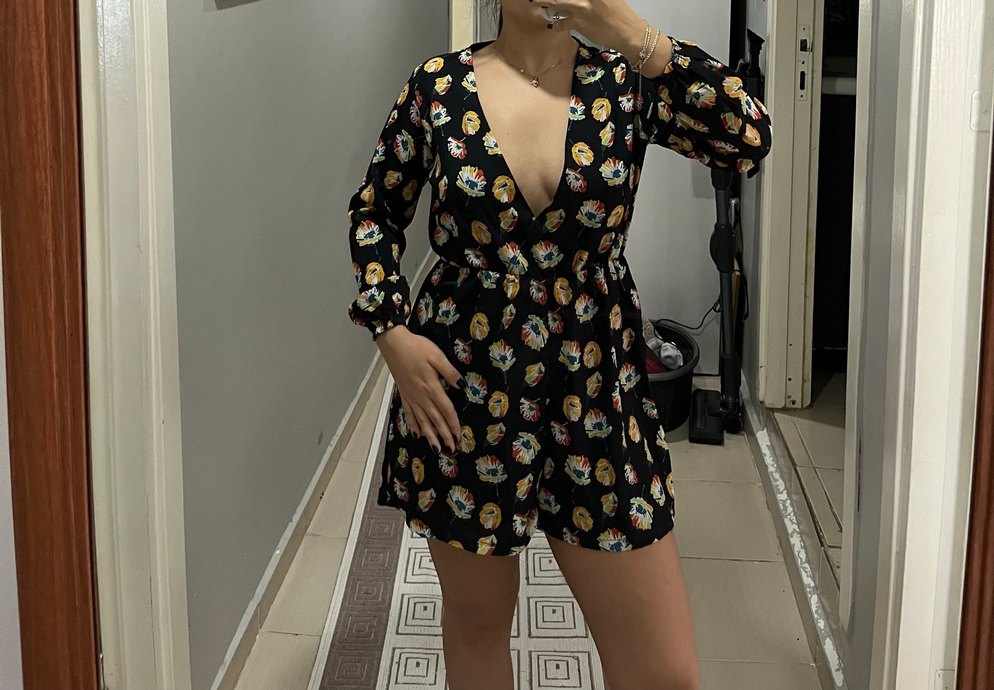 Uzun kollu, düğmeli, bol kesim mini elbise. Koyu renkli çok renkli çiçek deseni ve sentetik kumaş. Günlük sokak tarzı için uygun, bohem tarzda. Şort tulum şeklinde bir elbise. Bilekleri dardır, alan kişi terzide açtırabilir. Bir kez nişanda giyildi.