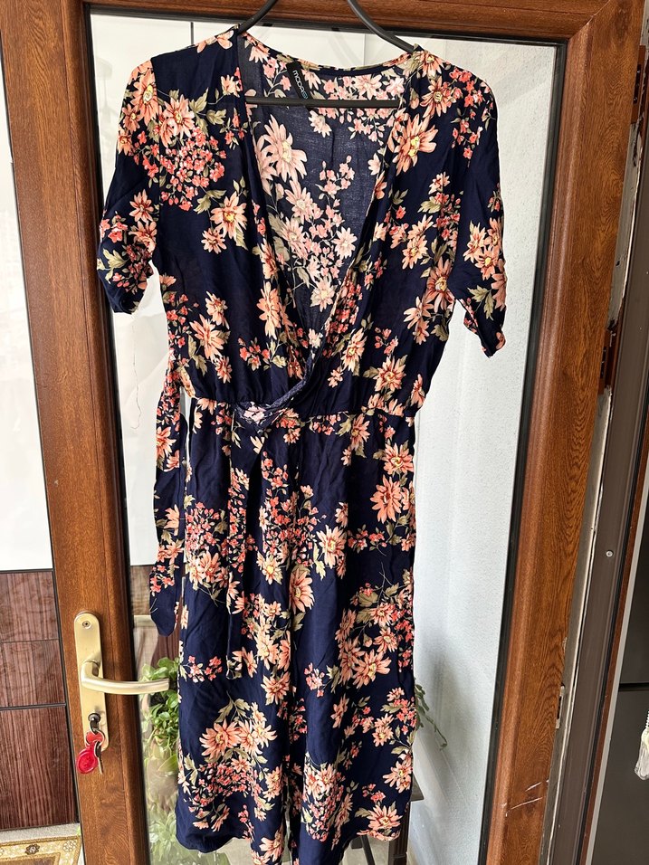 Çiçek desenli, V yakalı, kısa kollu, bol kesim tulum. Belde kemer detayına sahiptir.