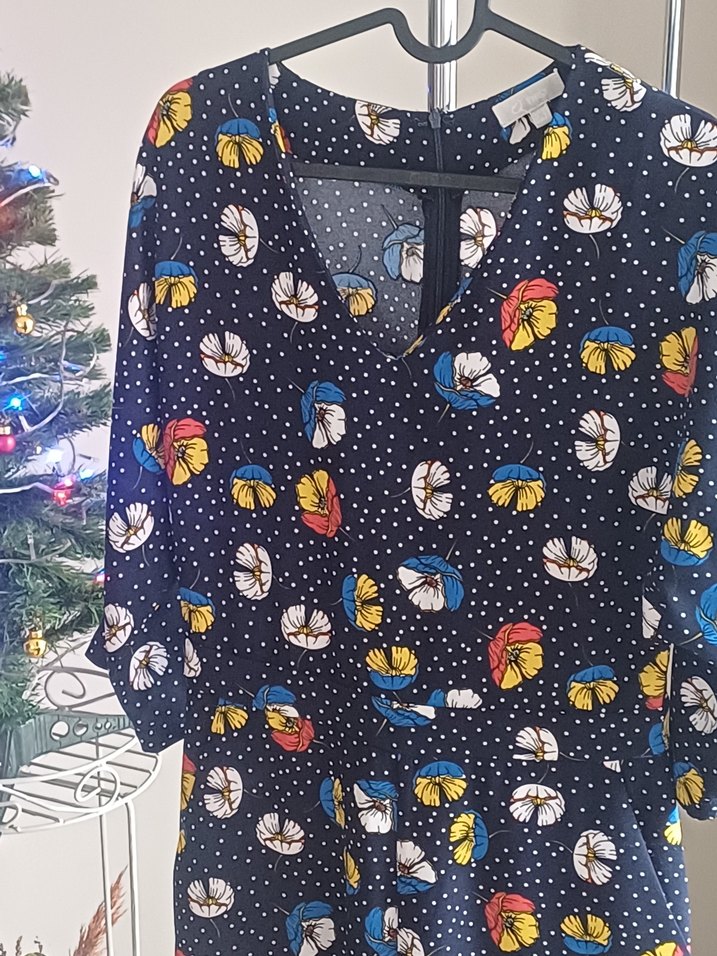 Rahat kesim, kısa kollu, V yakalı tulum.Çok renkli çiçek desenli, düğmeli ve midi boyda, yumuşak sentetik kumaştan yapılmıştır.