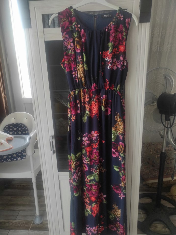 Kolsuz, uzun boylu elbise, koyu renkli çok renkli çiçek desenli, drapeli ve bol kesimlidir, V yakaya sahiptir.