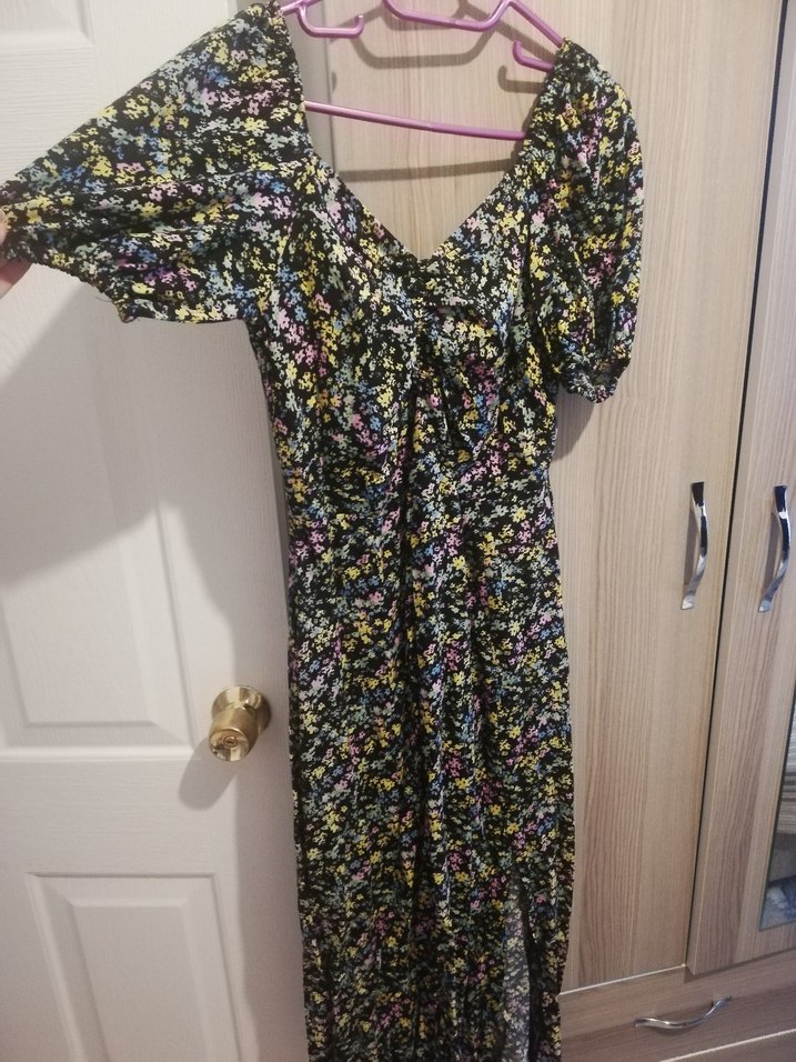 Bu midi bohem elbise, V yaka ve kısa balon kollu, vücuda oturan kesimdir.36-38 beden uyumludur. Koyu renkli çok renkli çiçek deseni ve drapeli tasarımıyla günlük kullanıma uygundur. Tek taraflı yırtmacı vardır.