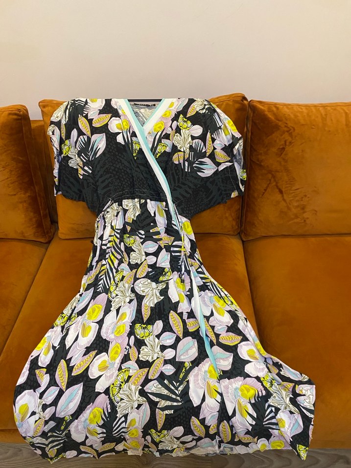 Çiçek desenli, koyu renkli uzun ve bol kesim elbise. V yaka, pileli detaylar ve ince askılı kollara sahiptir. Günlük kullanıma uygun bohem tarzda.
