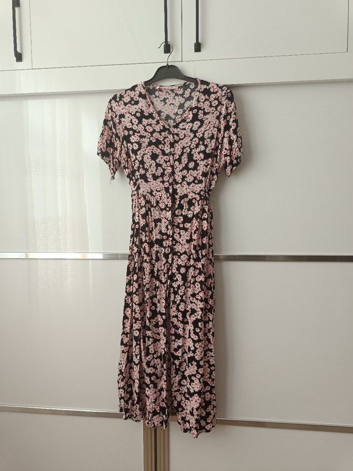 çiçek desenli, V yakalı ve kısa kollu uzun, bol kesim elbise. Önden düğmeli ve yumuşak kumaştan yapılmıştır, günlük kullanım için uygundur.