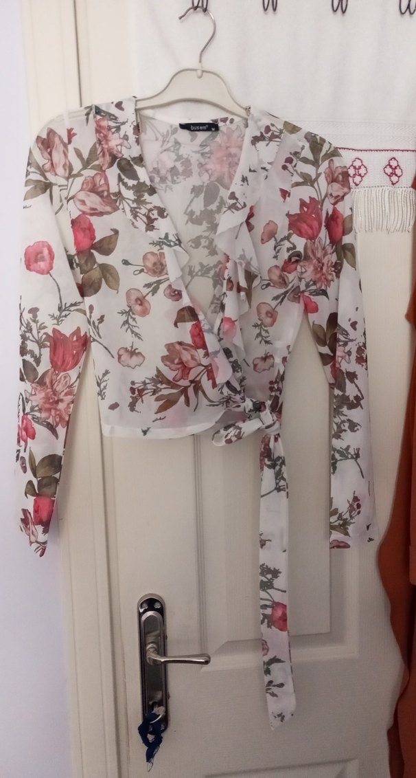 V yaka, uzun kollu, çiçek desenli ve drapeli beyaz bluz, günlük kullanıma uygundur.