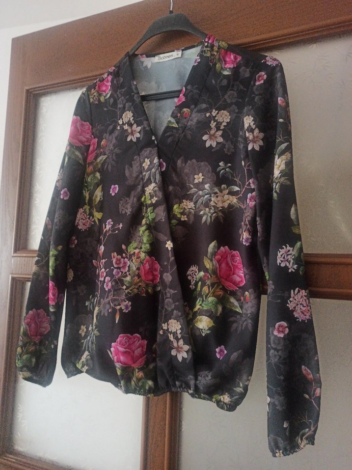 Koyu gri çiçek desenli, V yakalı bohem bluz. Uzun kollu ve yumuşak sentetik kumaştan yapılmıştır. Ofis için uygundur.