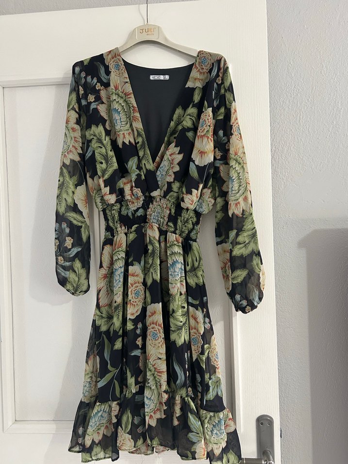 Uzun, bol kesim elbise, V yaka ve uzun kollu, koyu renkli çoklu çiçek deseni ve fırfır detaylarıyla. Yumuşak sentetik kumaştan, ofis için bohem tarzda uygun.