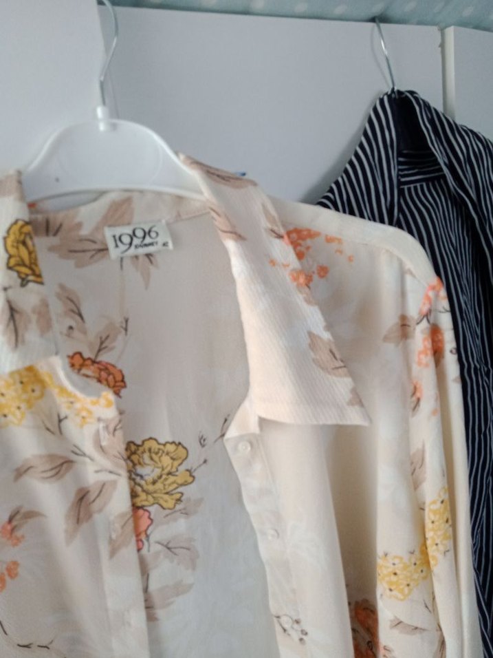 Uzun kollu, V yakalı ve düğmeli, hafif çiçek desenli bol kesim kadın gömleği. 1996 vintage tarzı, yumuşak sentetik kumaş. gorseldekilerin hepsi satılık 42 46 arası bedenler