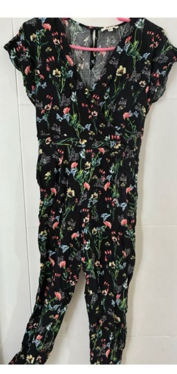 V yakalı, kısa kollu, bol kesim kadın tulum. Koyu renkli çoklu çiçek desenine sahip. Uzun boyda, bohem tarzda, günlük kullanıma uygun.