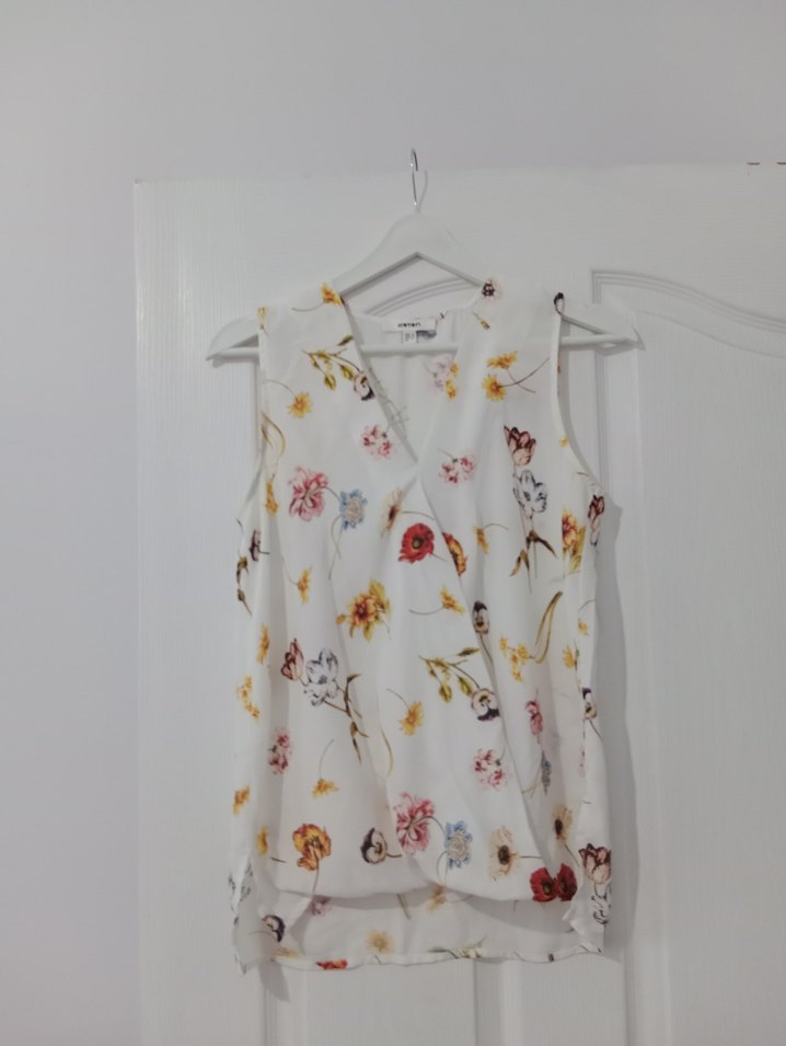 Çiçek desenli, V yakalı kolsuz bluz. Yumuşak sentetik kumaştan, bol kesim ve drapeli tasarıma sahip, bohem sokak stiline uygun.