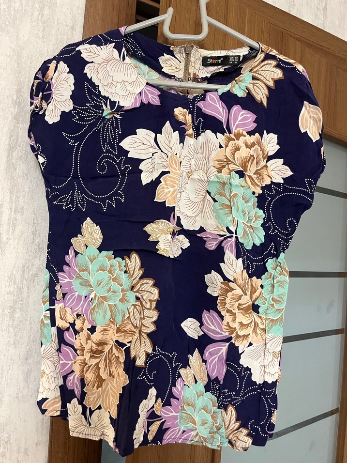 Kolsuz, V yakalı, bol kesim bluz. Koyu renkli çiçek desenli, sentetik kumaş ve dantel detaylı, bohem vintage tarzında günlük kullanım için uygun.