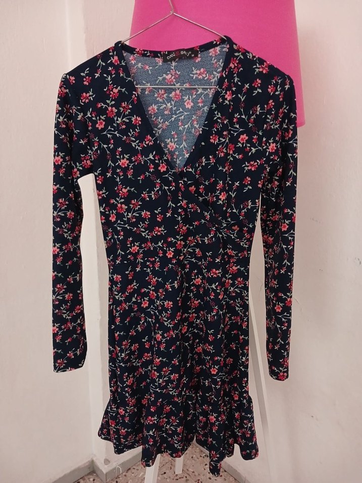V yakalı, uzun kollu ve çiçek desenli bu midi elbise, koyu renkli . Etek kısmında volan detayları vardır, günlük kullanım için uygundur.