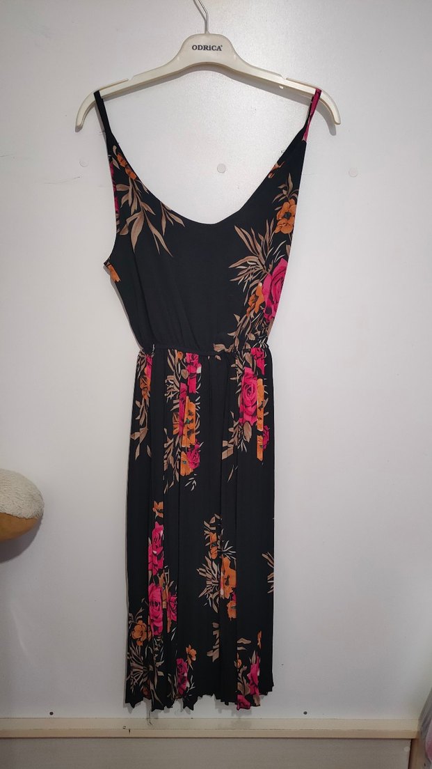 Karanlık renkli sentetik kumaş üzerine çiçek desenli, V yakalı, kolsuz, bol kesim ve drapeli uzun bohem elbise.