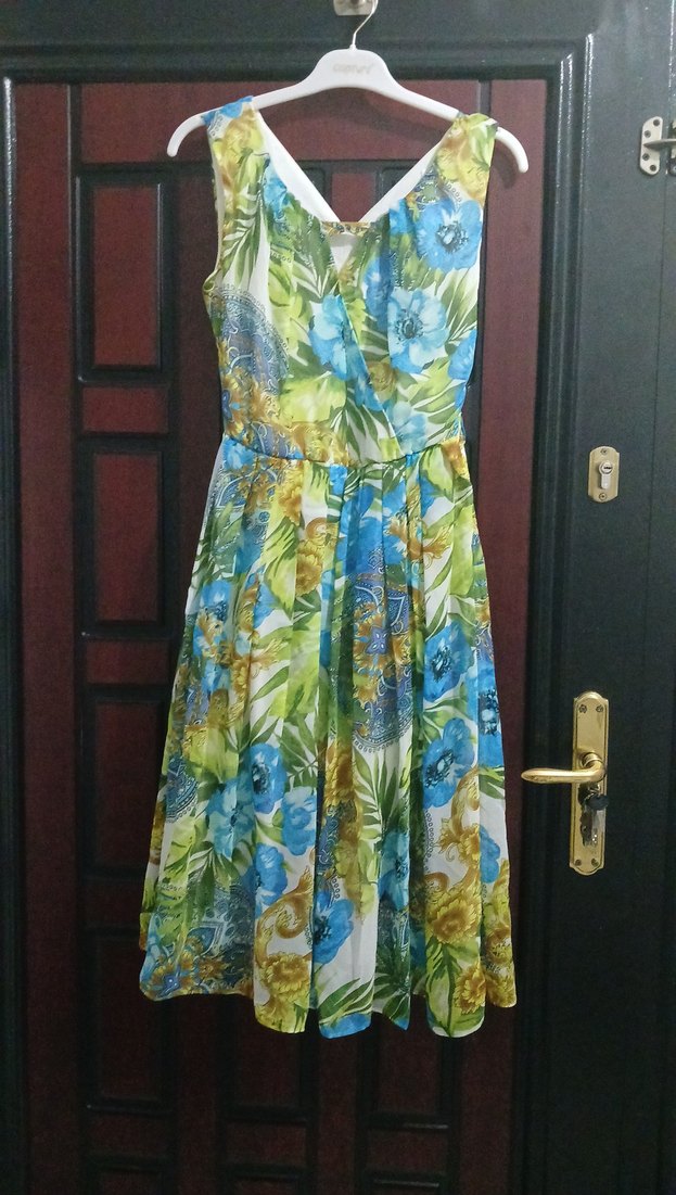 V yakalı, kolsuz, bol kesim uzun elbise. Canlı çiçek desenli, dökümlü yapıda, yumuşak sentetik kumaştan, parti için uygun.
