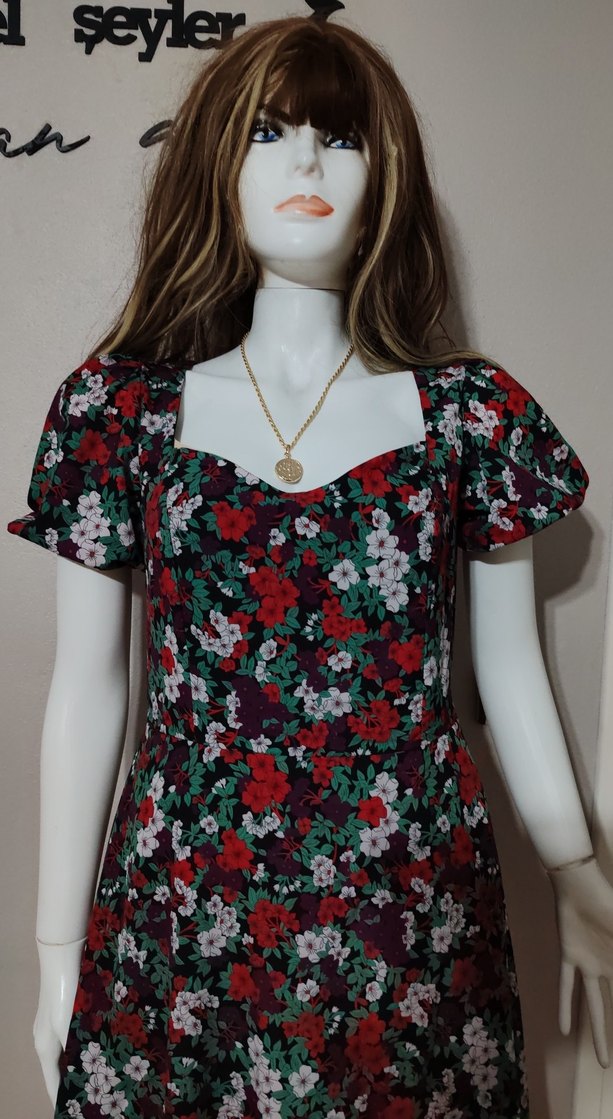 V yaka ve kısa kollu, çiçek desenli uzun ve vücuda oturan elbise, zincir detayıyla vintage bohem tarzını yansıtıyor. L ve xl beden uyumlu