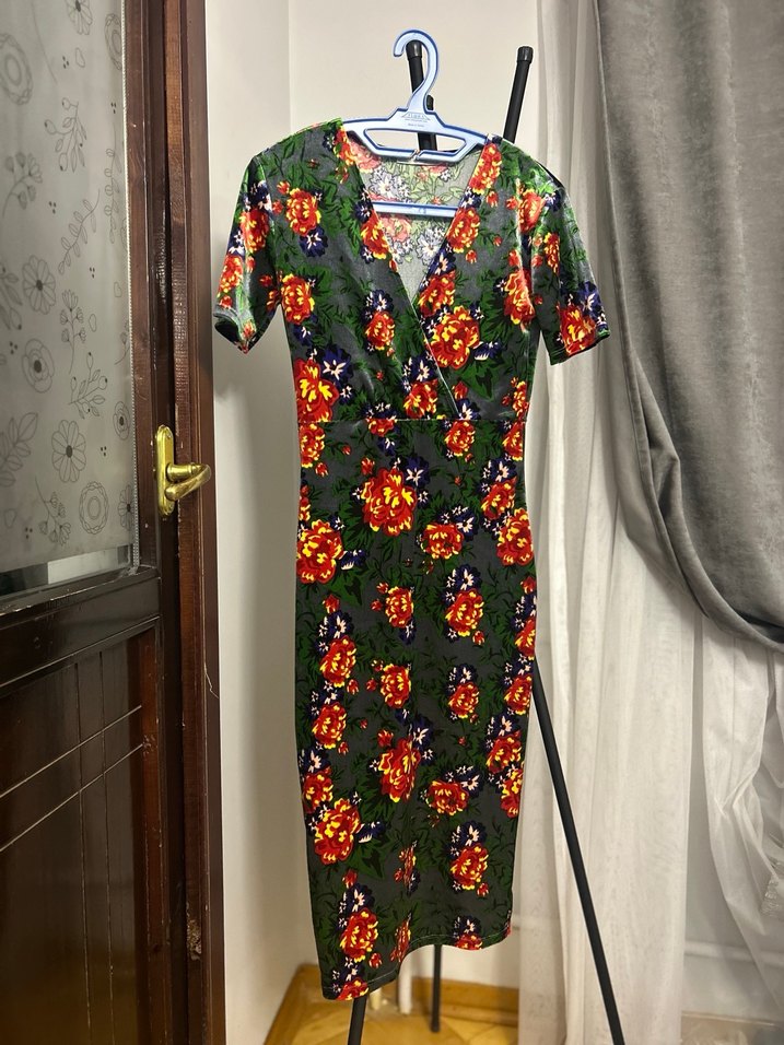 Renkli çiçek desenli, V yakalı ve kısa kollu, ince kesim uzun elbisedir. Yumuşak sentetik kumaştan, günlük kullanım için bohem tarzda drapeli. Parlak ladife vücudu sarar