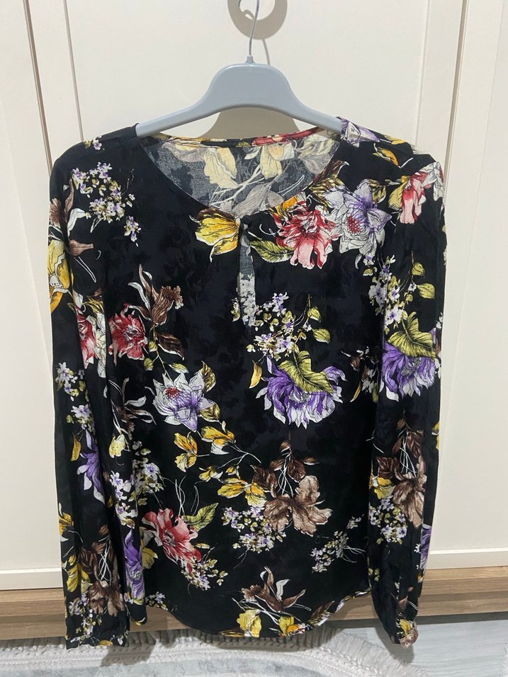 Bohem tarzda, uzun kollu, V yakalı, çok renkli çiçek desenli bluz. Düğmeli ve rahat kesim, yumuşak sentetik kumaştan yapılmıştır.