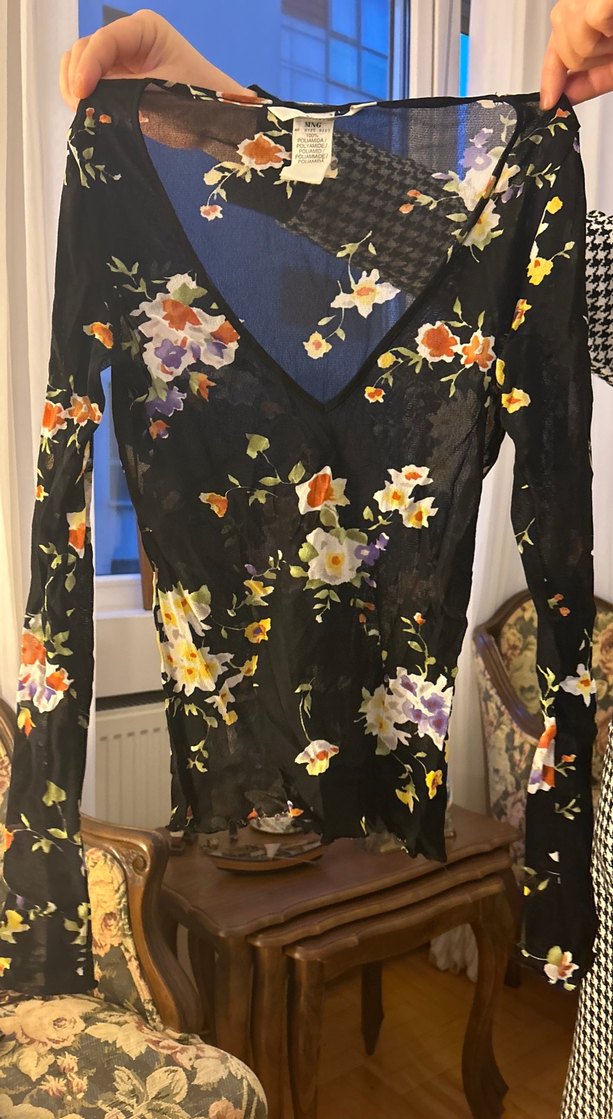 Bu dar kesim bluz, uzun kollu ve drapeli V yakalıdır. Koyu renkli çoklu çiçek desenleriyle bohem tarzı sunar ve ofis için uygundur.