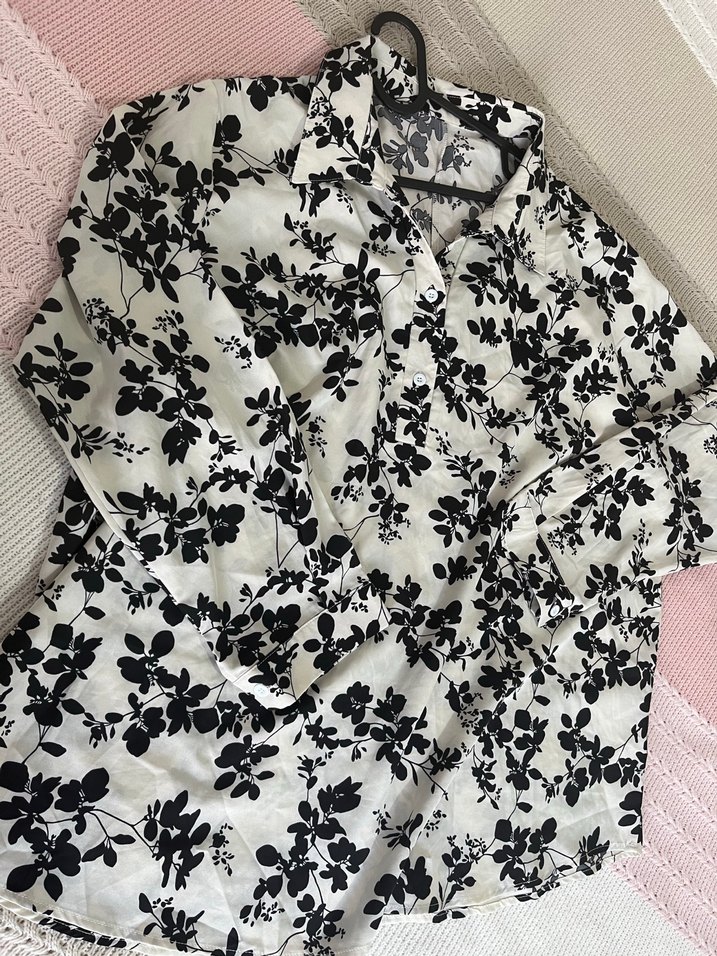 Pamuklu beyaz gömlek, gri çiçek desenli, V yakalı ve uzun kollu. Düğmeli, bol kesim ve normal midi boyda, günlük şık sokak stili için uygun.