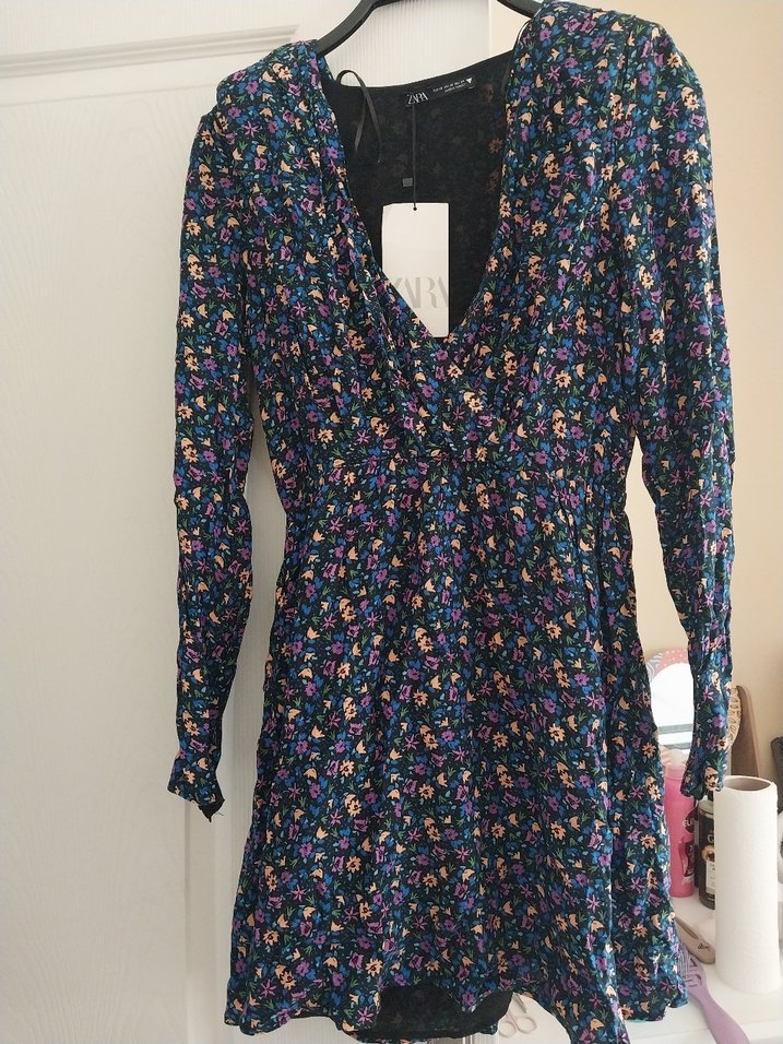 Bol kesim, uzun kollu midi elbise, V yakalı ve çok renkli çiçek desenli. Düğmeli ve sentetik kumaştan, sokak modasına uygun.