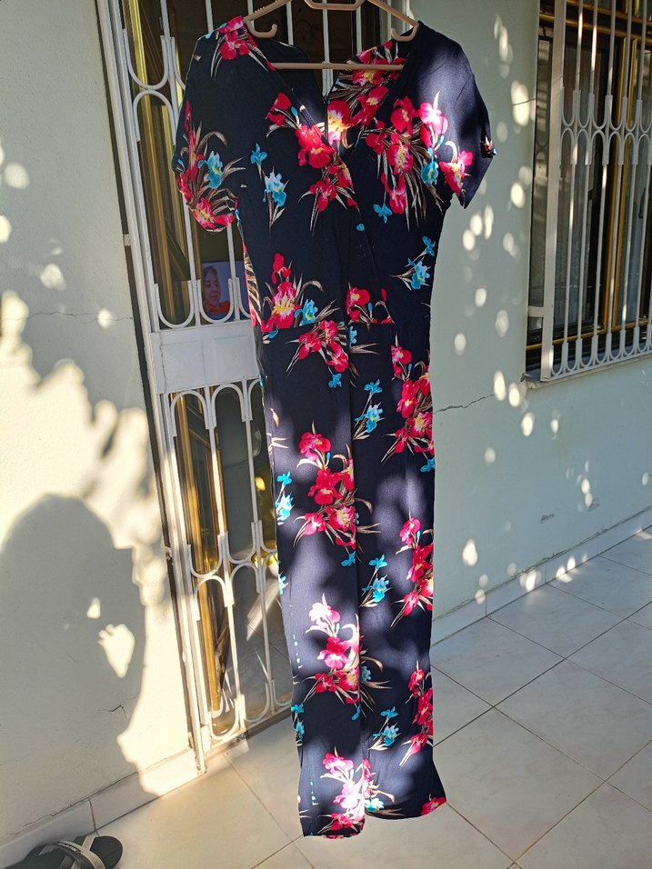 Çiçek desenli, V yakalı, kısa kollu, sentetik kumaştan üretilmiş, vücuda oturan uzun tulum. Dökümlü yapısıyla bohem tarzı yansıtır, dış mekan kullanımı için uygundur.