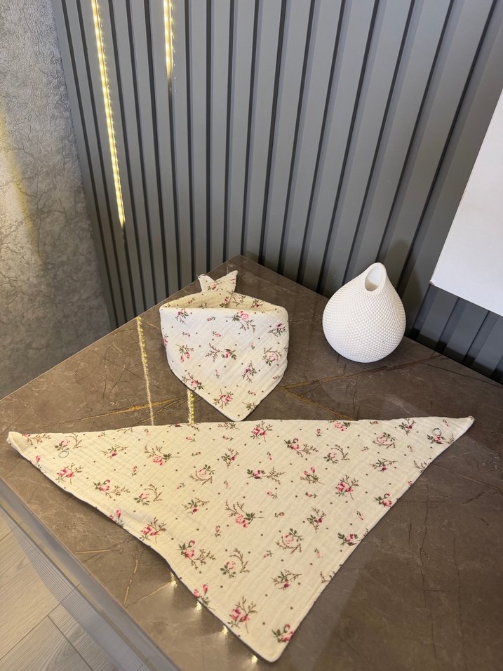 Beyaz renkte, hafif çiçek desenli üçgen şeklinde bebek önlüğü, küçükler için yumuşak ve şık bir görünüm sunar. 2 adettir.