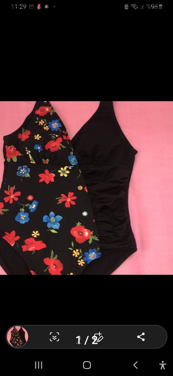 Çiçek desenli ve siyah renkli, kısa kesim, strappy askılı, vücuda oturan kadın mayo. Rahat ve şık bir görünüm sunar.