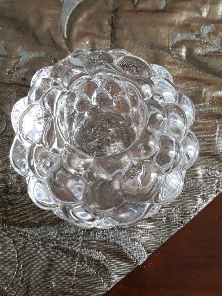 Konvansiyonel tarzda, çiçek desenli şeffaf cam mumluk.