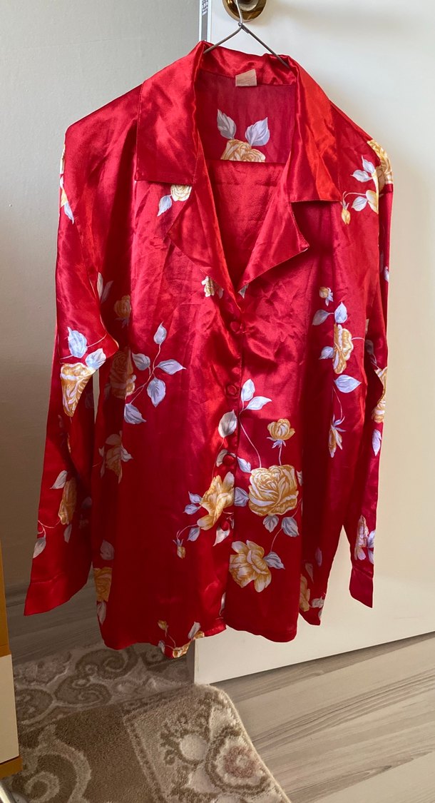 Parlak kırmızı kumaş üzerine çiçek desenleriyle süslenmiş, bohem tarzda, uzun kollu ve bol kesim saten vintage pijama. Midi boyda.iki koltuk arası 56 cm uzunluk 76 cm alt uzunluk 100 cm basen 135 cm bel lastik 67 cm