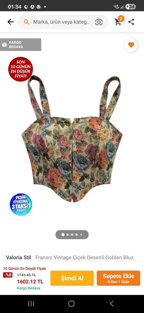 Çiçek desenli, düğmeli önü ve askılı kısa, vintage tarzda sentetik kumaştan yapılmış dar kesim bustiyer. Günlük kullanıma uygun. Daha yeni aldim bana bol geldi bir tik o sebeple satip kendime bir küçüğünü alacağim asiri guzel her kiyafetle kolaylikla kombinlenebilir