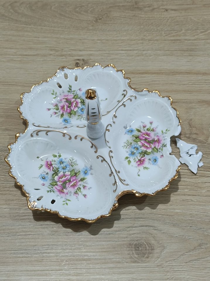 Beyaz tabanlı, çiçek desenli ve altın detaylı vintage tarzı porselen servis tabağı. Dört bölmeli ve taşıma kolaylığı için ortada tutacağı var. kenarında kırık var değerlendiririm diyen alsın muadillerine göre fiyatı belirlendi hiç kullanılmamıştır