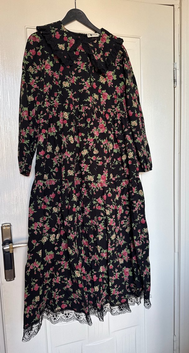 Çiçek desenli, siyah zemin üzerine çok renkli, uzun kollu, yakalı ve bol kesim vintage tarzda elbise, fırfır detaylı, günlük kullanıma uygun.