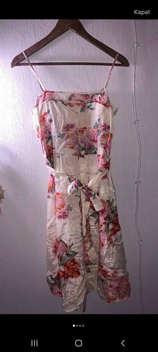 Yumuşak pembe tonlarda, vintage bohem tarzda, çiçek desenli, kolsuz ve uzun kesim, beli bağlamalı dar kesim elbise. ip kısmında sökük var