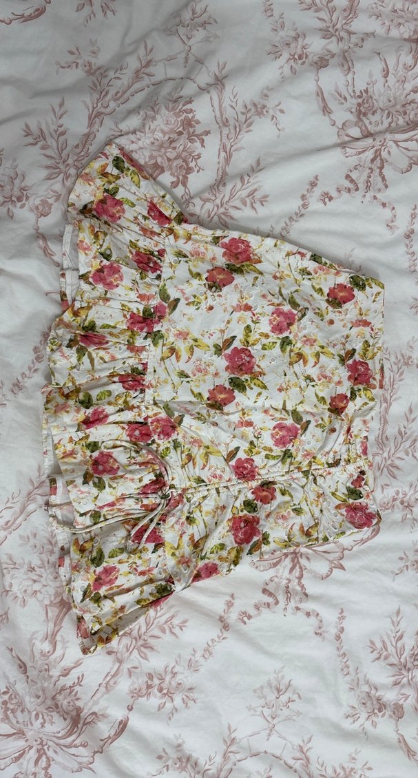 Beyaz tekstil üzerinde pastel çiçek desenli, bol kesim midi . Volan detaylı, bohem tarzda, düğünler için uygun.