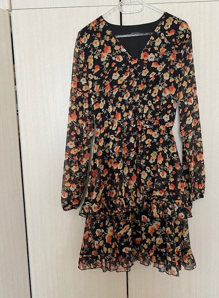 Bohem tarzda, uzun kollu, V yaka ve bol kesim midi elbise. Koyu renkli çok renkli çiçek desenli, volan detaylı, yumuşak sentetik kumaştan yapılmıştır.