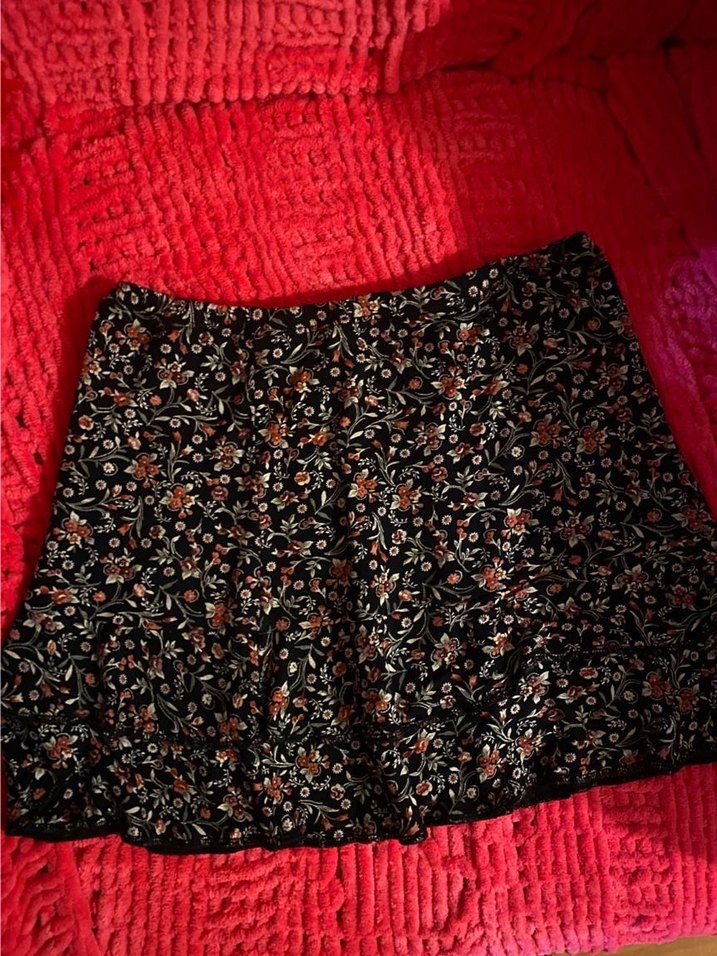 Bohem tarzda, volanlı uçlu, çiçek desenli, bol kesim mini etek. Koyu ve çok renkli, günlük kullanıma uygun.