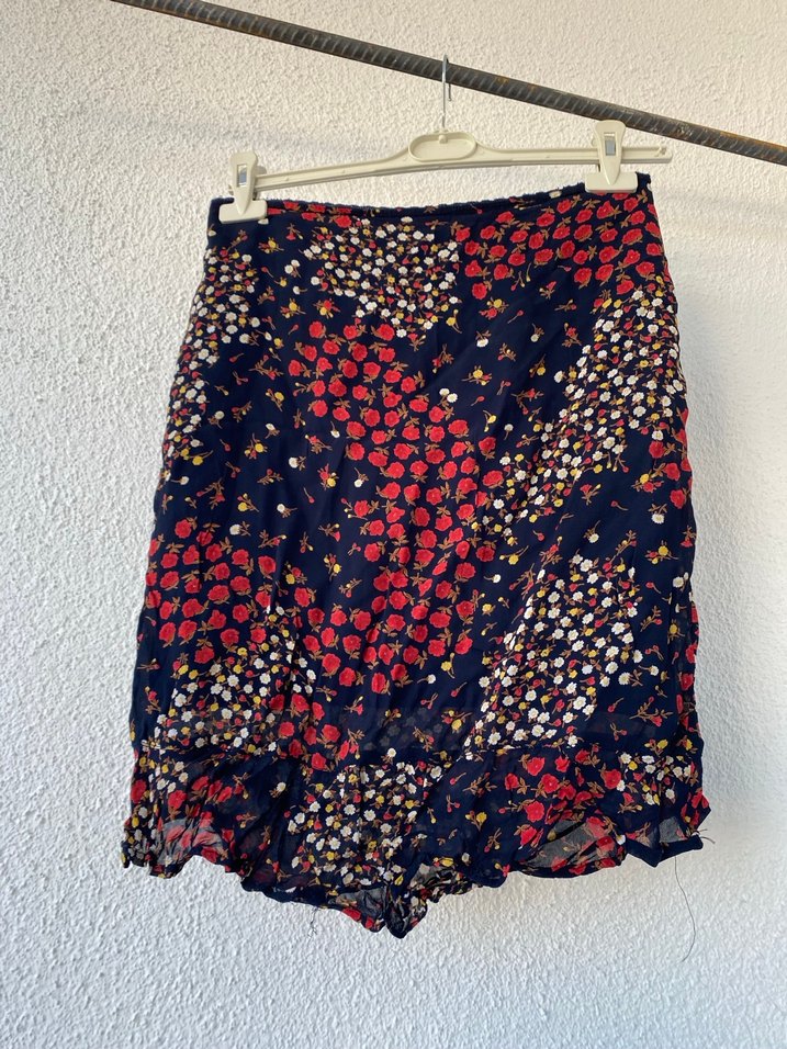 Renkli çiçek desenli, volanlı ve bol kesim mini etek, bohem stil için uygun.