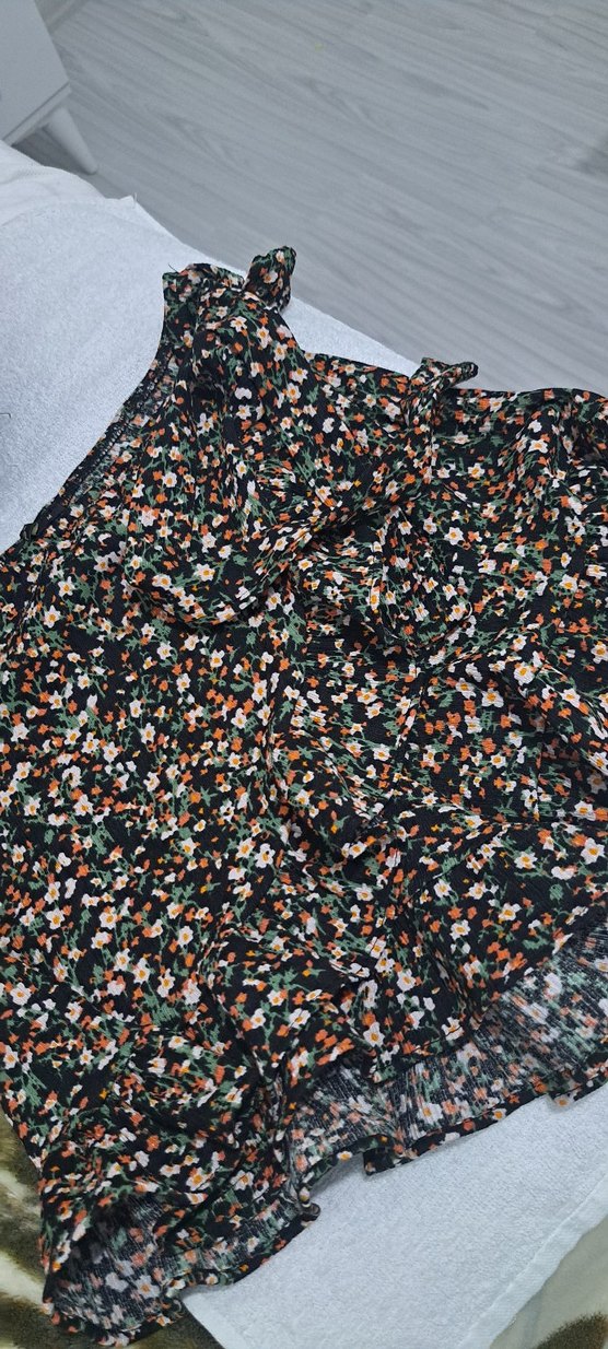 Koyu renkli çok renkli çiçek desenli, volan detaylı ve bol kesim kısa mini etek, bohem tarzda outdoor kullanıma uygundur.