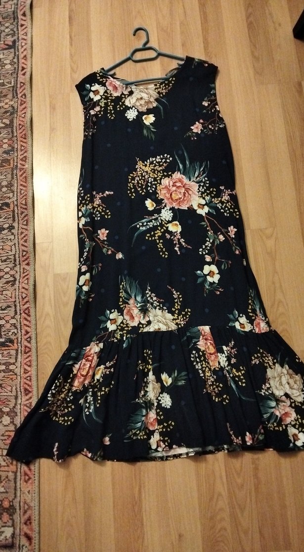 renkli çiçek desenli, volanlı, uzun ve kolsuz bohem elbise. Salaş kesim ve askısız yaka ile rahat bir stil sunar .