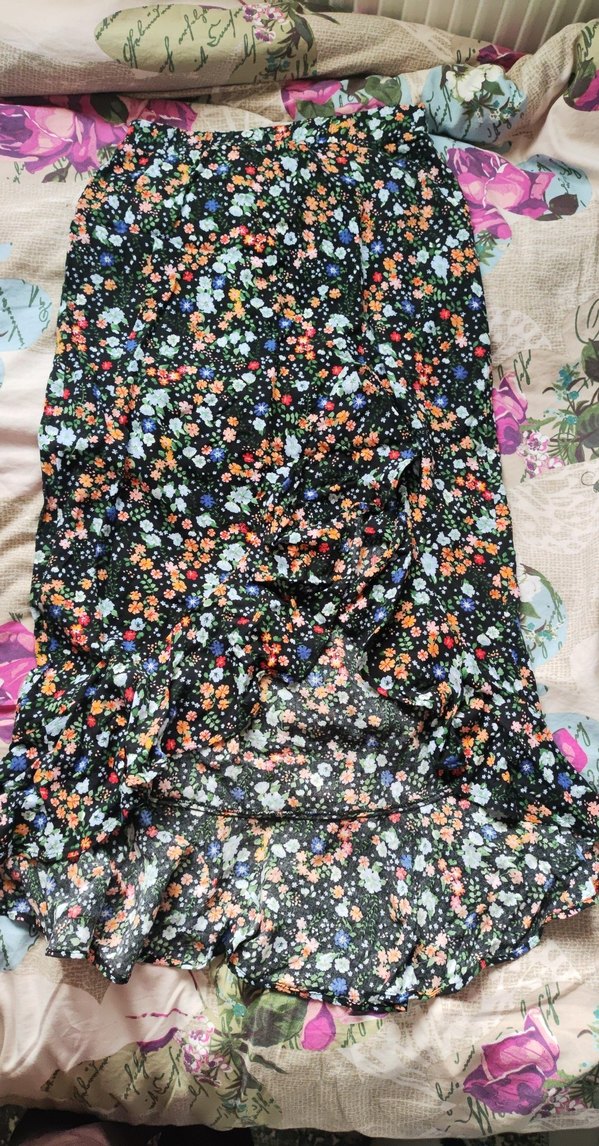 Sentetik kumaştan yapılmış, koyu renkli çok renkli çiçek desenli, volan detaylı, uzun ve vücuda oturan midi etek. Bohem tarz ve açık hava etkinlikleri için uygundur.